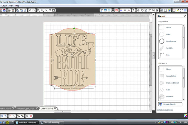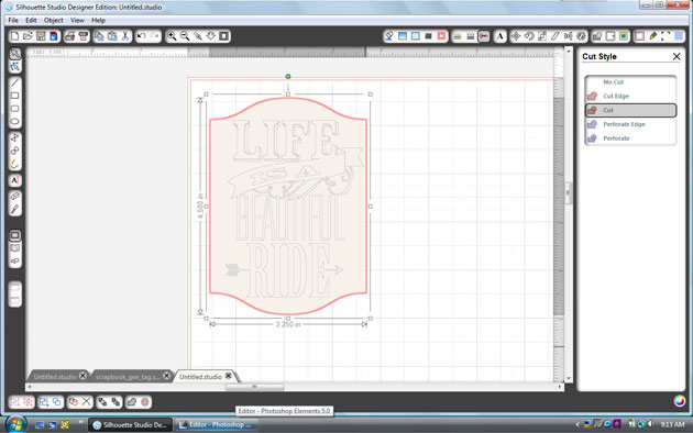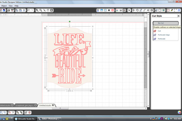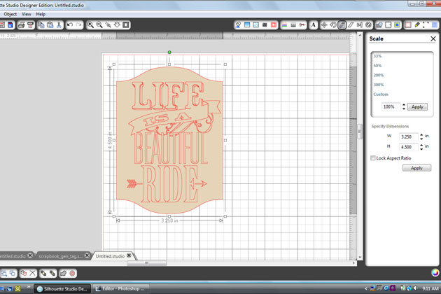 I resized the card to 4-1/2″h (keep aspect ratio). Next, open the ‘life is a beautiful ride’ file and scale it down to fit the card.