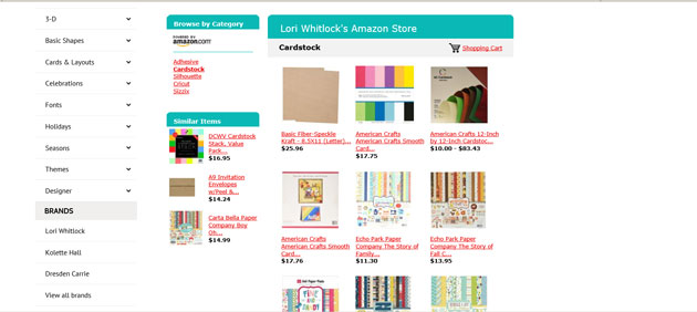 Hi Everyone! I often get questions about the types of adhesives, papers and tools that I use, as well as where to find some of the products I design for Echo Park and Sizzix. I decided to put together an Amazon Shop with links to the items I use most. You can access that store from both my blog as seen here: