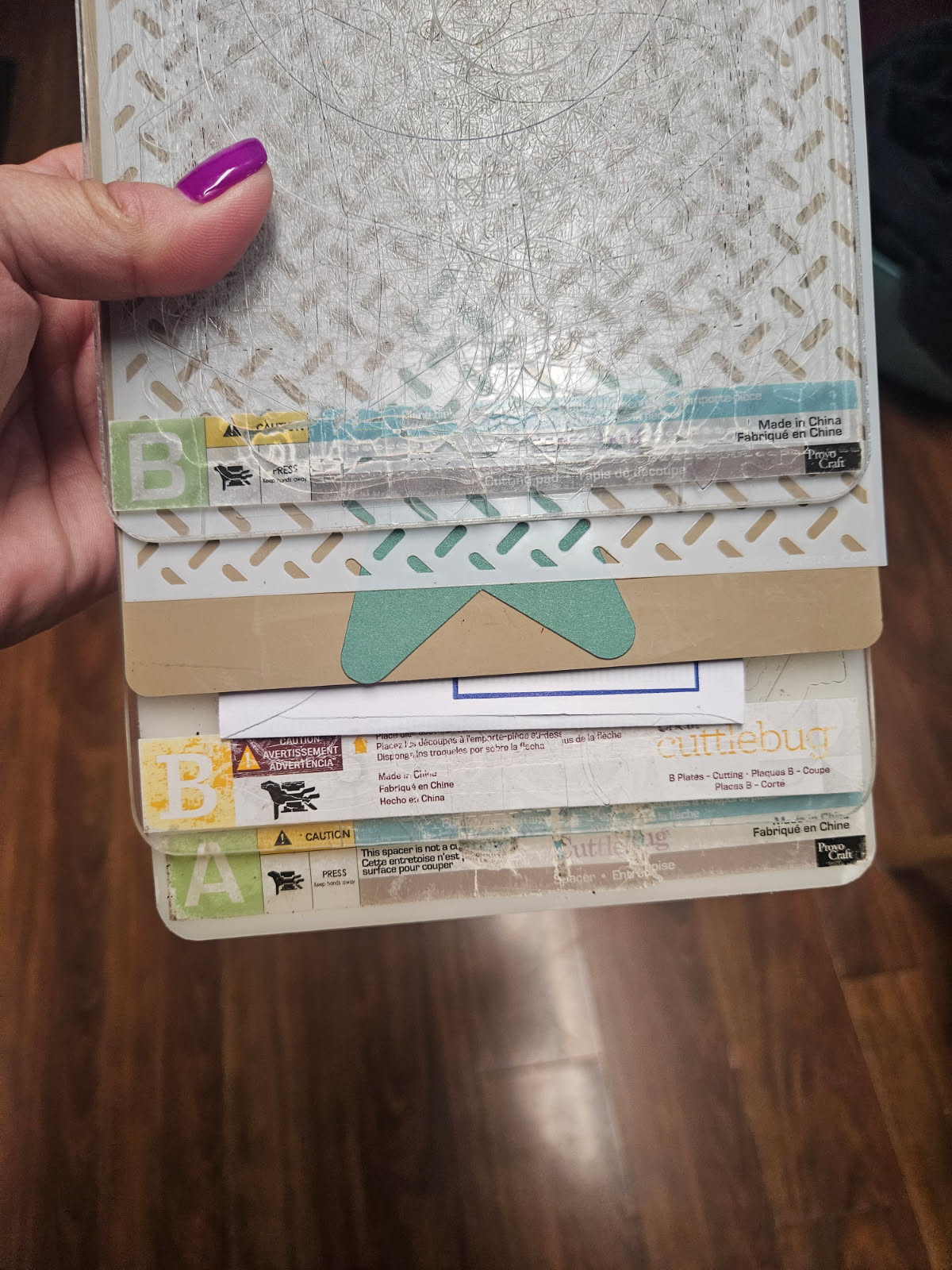 Layer your mats and stencil like below (my mats are well loved). You will build from bottom up. A mat on bottom, B mat, shim, rubber mat (or extra shims), paper, stencil, B mat. Run it through your embossing machine.