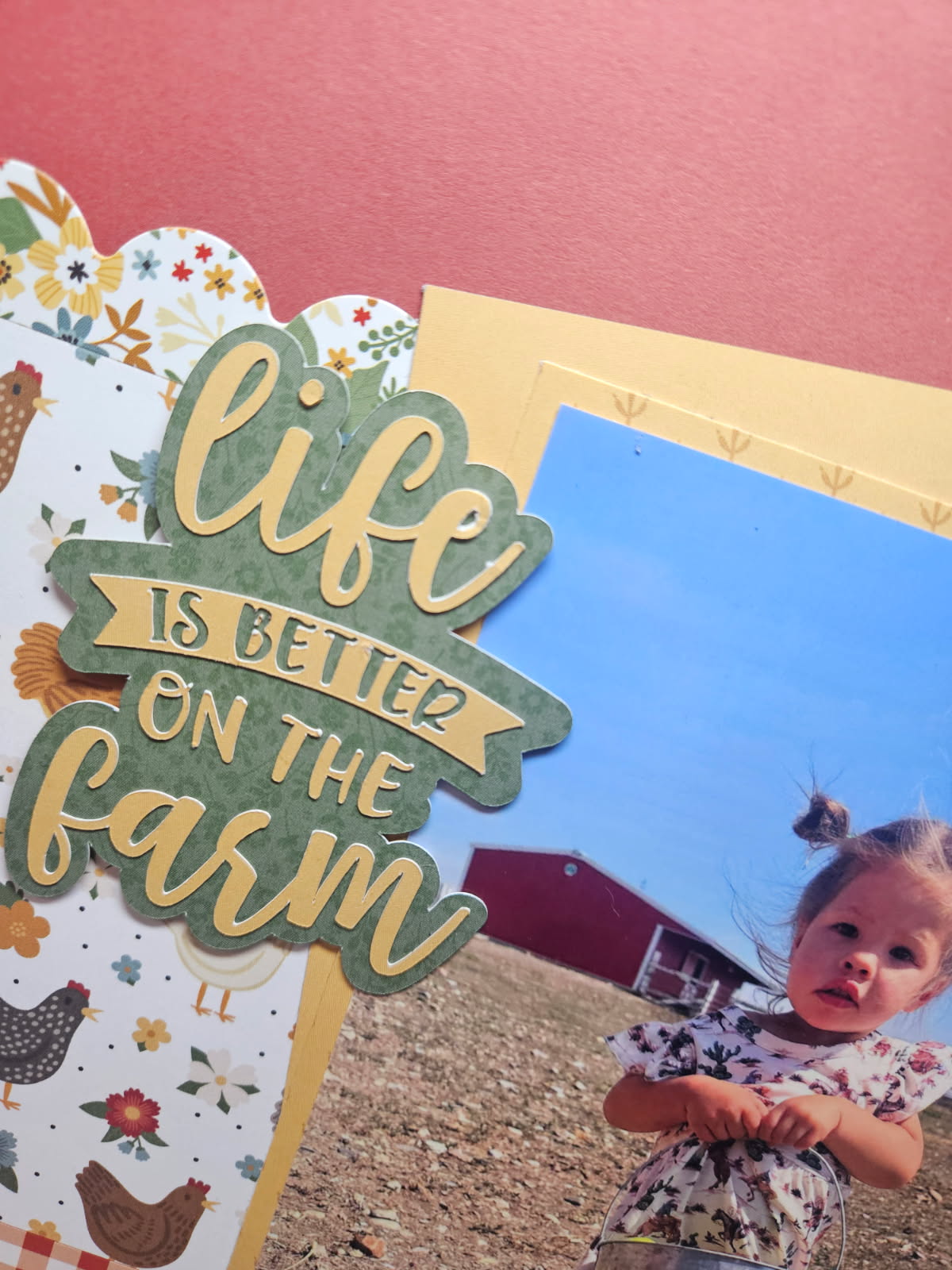 I was so excited when this Chickens paper from Echo Park Paper and Lori Whitlock arrived on my door step. I knew this egg-stra cute photo of my granddaughter taking her bucket of chicken feed to the chickens needed to go on here. Last summer I took the grandkids to their aunt’s farm to see all the animals. Mary was all about feeding the chickens and horses.