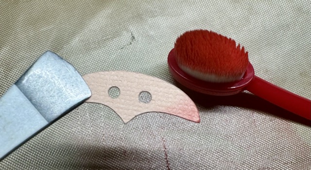 After I cut everything out I decided to discard the round cheeks for some pink chalk that I applied with a paint brush. I then assembled the faces of my characters. The front of the Santa also has a belt, a white ruffle for the hat, an additional cover for the top of the hanger and a white ruffle for the bottom of his jacket.