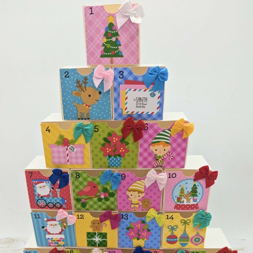 Today, I’m excited to show you a fun **diy** project: a festive Christmas Advent countdown from Lori Whitlock (SVG, Silhouette). You can also find Lori’s original assembly tutorial HERE. This Advent countdown forms a Christmas tree when assembled and includes 25 little boxes that you can add a small treat or toy inside. Join me as I demonstrate **how to make** this adorable Christmas Advent, it’s a wonderful addition to your **Christmas crafts** collection.