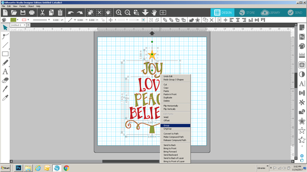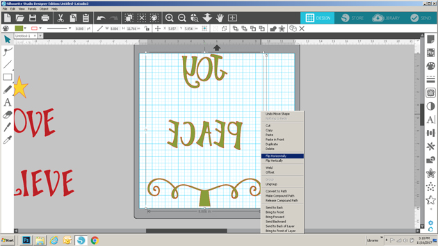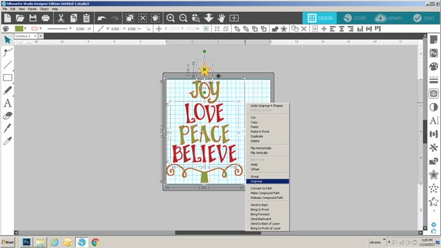 Making the mini wreaths was fairly easy with my Silhouette Cameo, but I have a couple hints and tricks to make it really easy! I started with Lori’s Circle Monogram Frame (Silhouette Design Store or Lori Whitlock SVG Shop) to make the wreath. This is possibly my favorite SVG file. The wreath is actually 6 seperate pieces. Since I am making a small wreath, I’m going to release the compound path and make all of the leaves filled in, which is easier for me to cut.