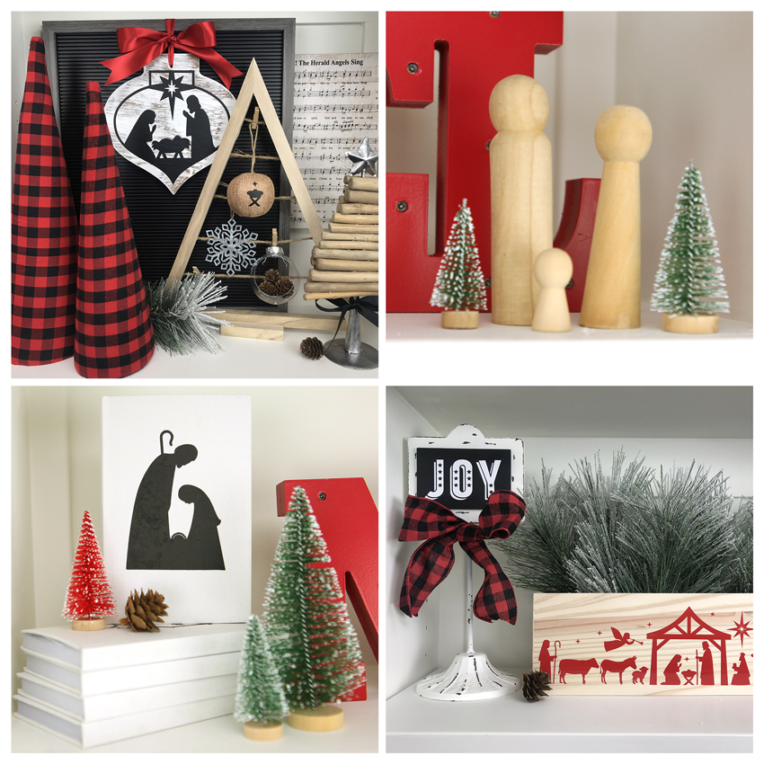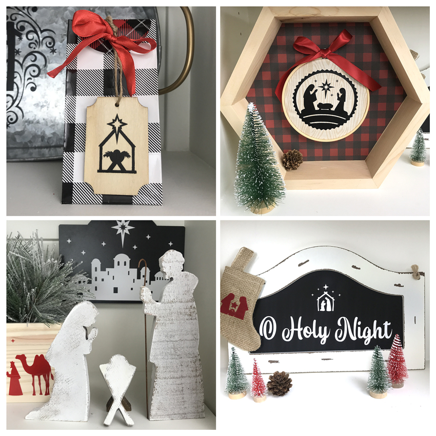 Hi Everyone! Christmas is just around the corner and we’ve been working on a bunch of nativity projects. Perhaps you’ll find some inspiration in our creations. For all of these projects, I’ve used “blanks” that I ordered from Oriental Trading and nativity cut files from my SVG Shop. Oriental Trading is a wonderful place to find a great variety of value-priced home decor, holiday, and craft supplies — be sure to check out what they offer. I’ve listed the file links in my SVG Shop and the Silhouette Store beneath the pictures.