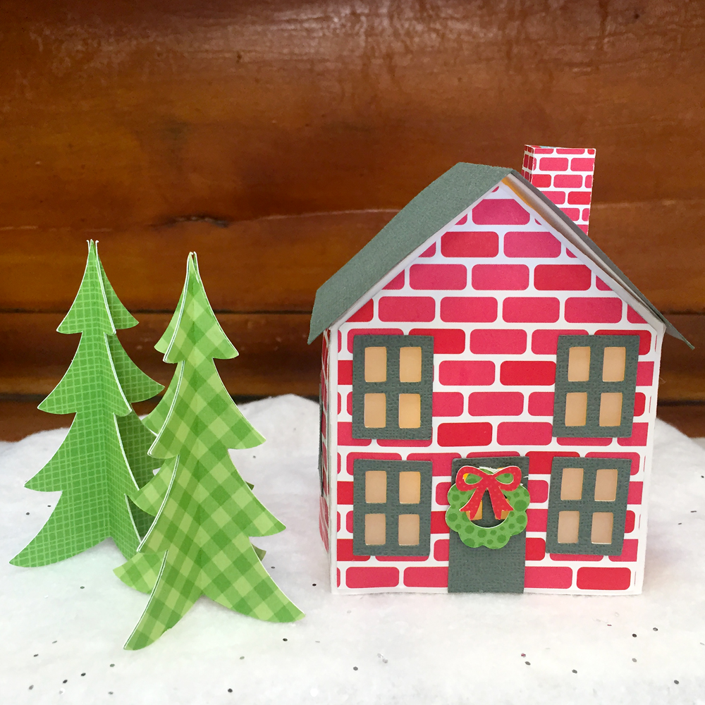 Each of the houses can be lit with a small electric tea light. The class also includes cut files for the trees and snowmen. The whole project actually folds flat to fit in a storage box, which is included with the cut files! Here are some close-up of the individual houses…