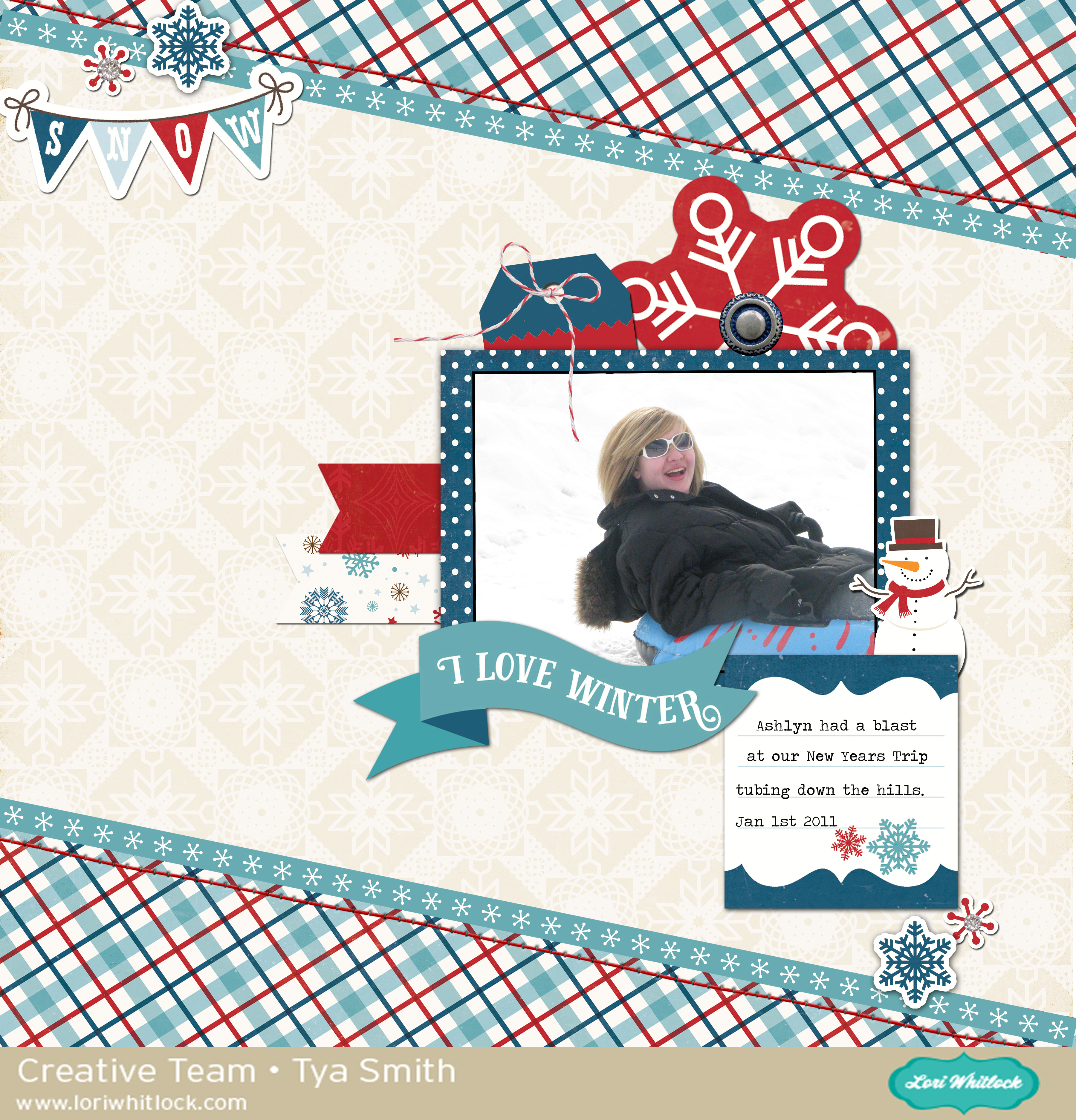 Hi Everyone- It’s Tya and today I am sharing with you a digital scrapbooking page. Winter is in full swing here in Utah where I live. We have had soooo much snow this year! Thankfully I am one who really likes the snow and my family and I love to ski and snowboard and do many other winter activities. Today I am sharing a page that shows another one of our favorite winter activities- tubing! Every New Years week , my husbands family rents a cabin up in the mountains and the kids tube all day long. Its really a lot of fun. My favorite part is taking pictures of everyone zooming down the mountain – so that’s what I am sharing with you today. I loved the look of my daughters face – she looks like she is having so much fun! Lori has some great Winter themed Digital Kits over on Snap Click Supply. Here is the one I chose to use: