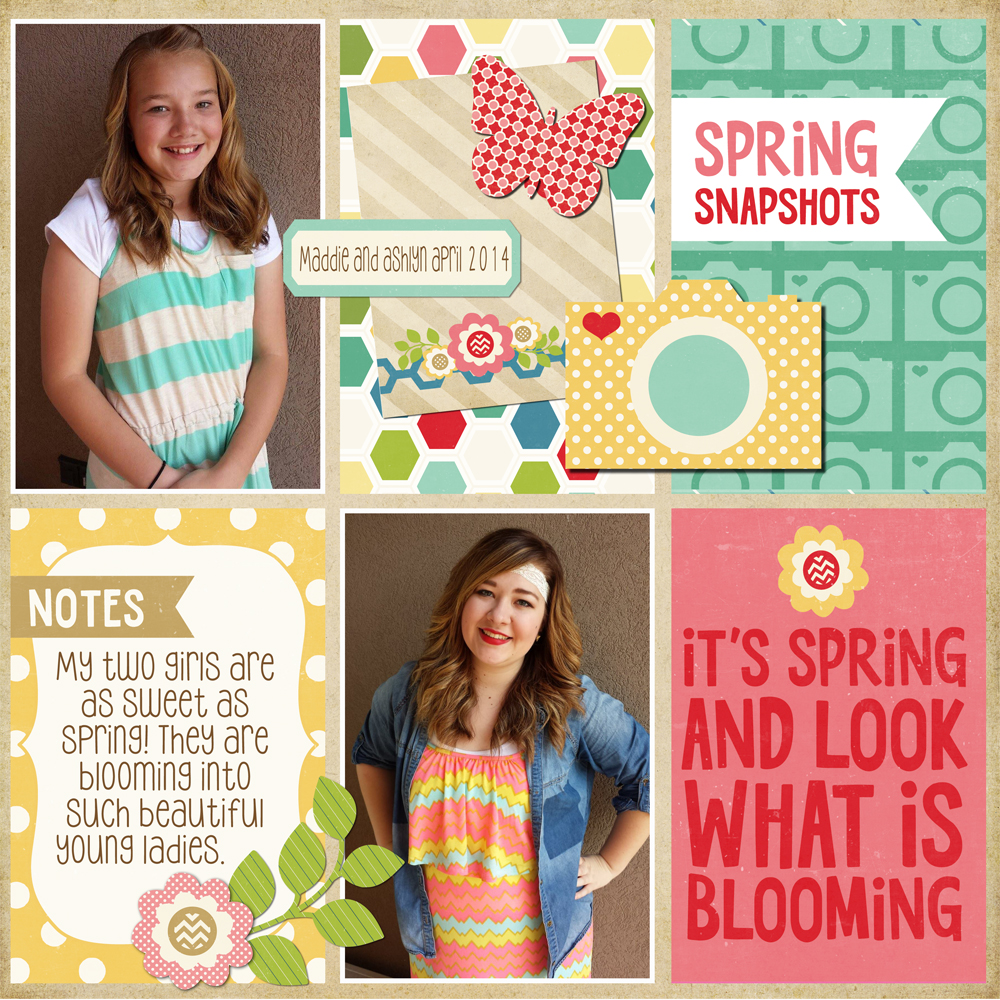 Hello Lori Whitlock fans – it’s Tya and I am up on the blog today sharing with you a digital scrapbooking layout. I have always really liked all of Lori’s Mod themed digital kits. Today I am sharing with you a layout featuring a few different kits from her Mod themes. These kits are bright and Springy and they have some really cute icons to play with too. Here is my layout: