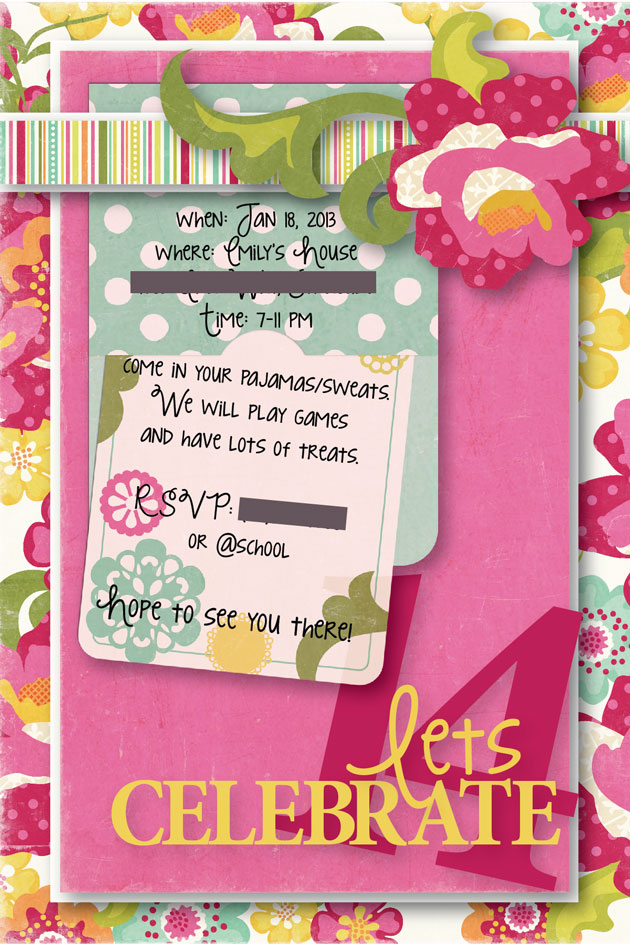 Finally, I have a project to share. I try to get in on the action whenever I can, and this week I am sharing with you a birthday invite I made for my daughters 14 birthday next week. I used Lori’s Maggie Collection, which is one of my favorites. For more info you can check it out on my blog.