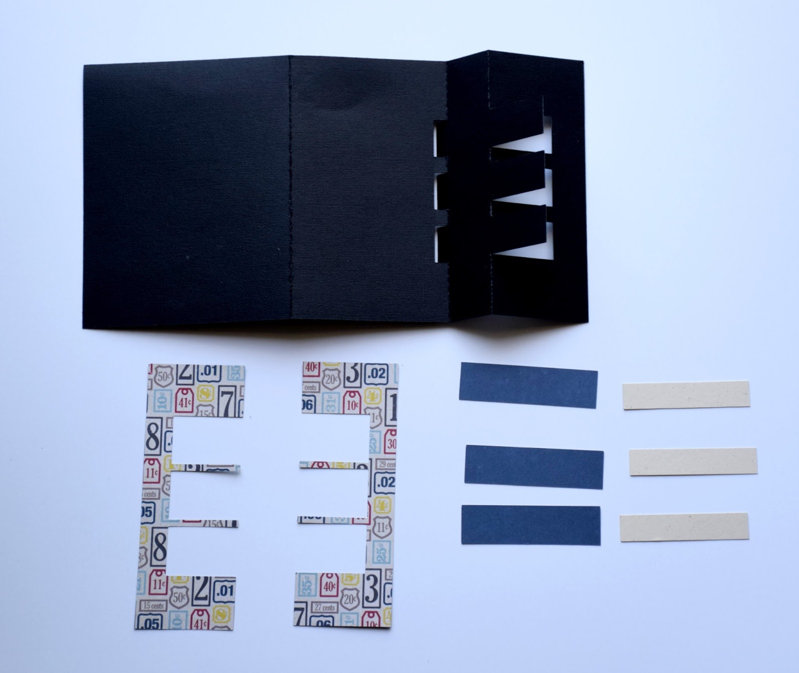 Here are the pieces all cut out. The brown piece is the base and the other pieces are for the front and bars of the card.