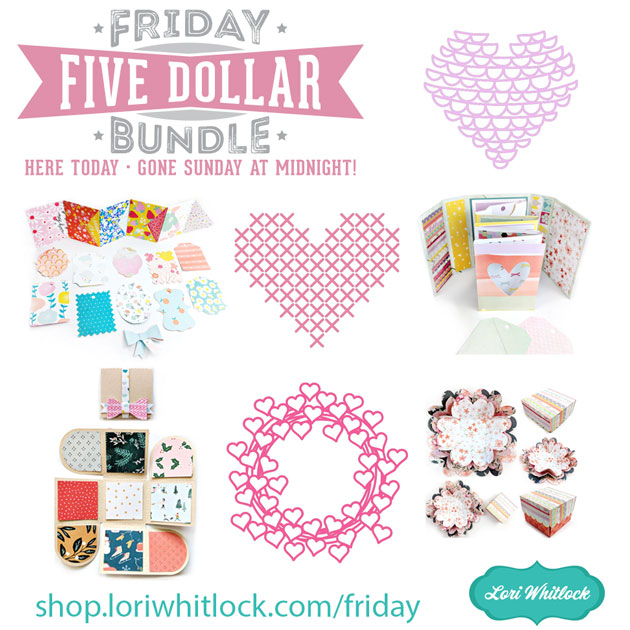 Today is the last day to pick up this awesome Friday $5 Bundle! This bundle is ONLY available until midnight. These SVG files can be used with Cricut Explore, Silhouette Studio (with the Designer Edition upgrade), Scan N Cut, and any other cutter that will work with SVG files. This bundle includes 4 awesome mini albums and 3 gorgeous heart graphics all designed by Paige Evans.