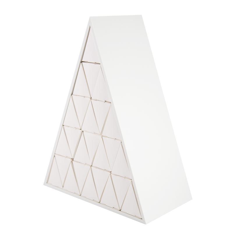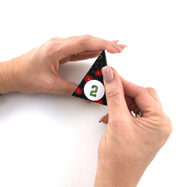 Once you have everything cut out it’s time to assemble. Simply glue the triangles to the front of the boxes. The scene in the back is numbered and has little tabs that insert into the advent calendar base making it easy to put those in place.