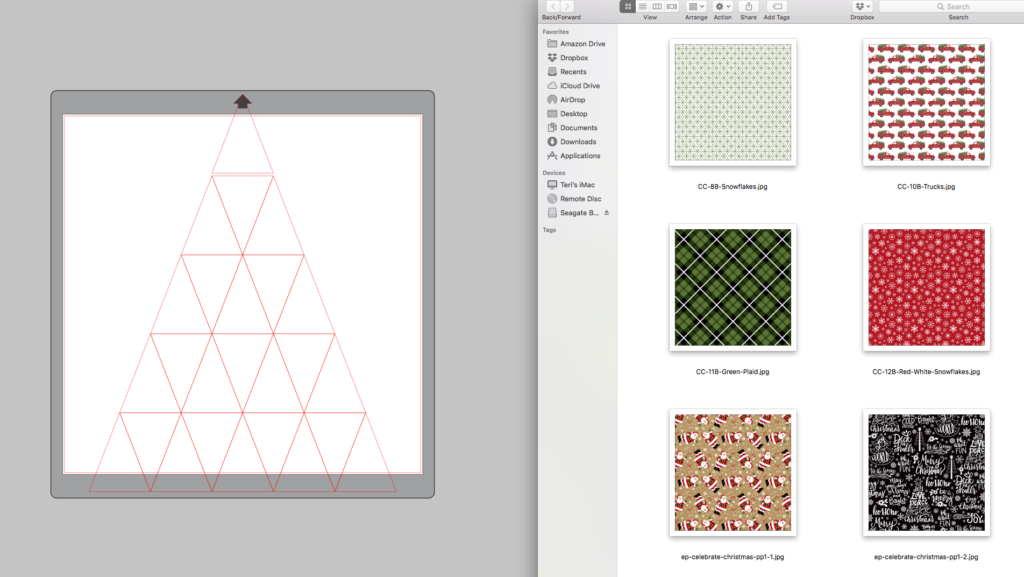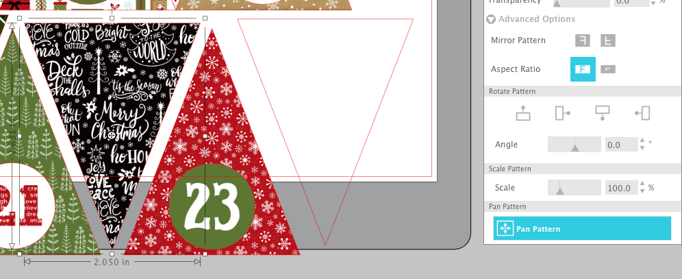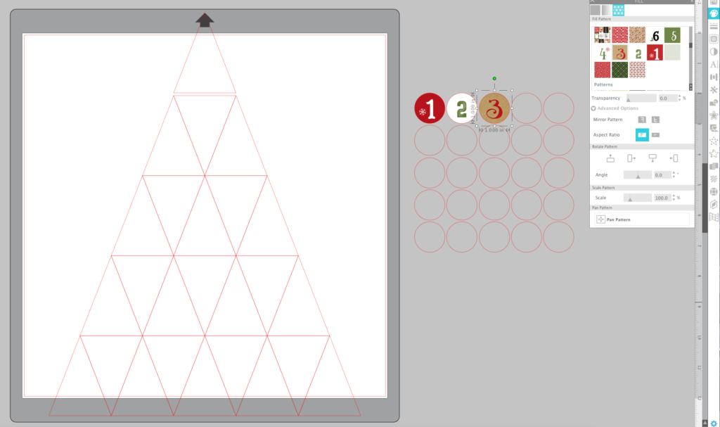 After I was finished with the numbers, I added fills to the triangles to coordinate with the number fills. Did you know you can simply drag and drop pattern into the triangles directly from your computer window? No need to upload them into your pattern library. Of course adding them to your library is great, but dragging them in from your computer window is sure handy and quick! I used the digital version of my Celebrate Christmas Collection.