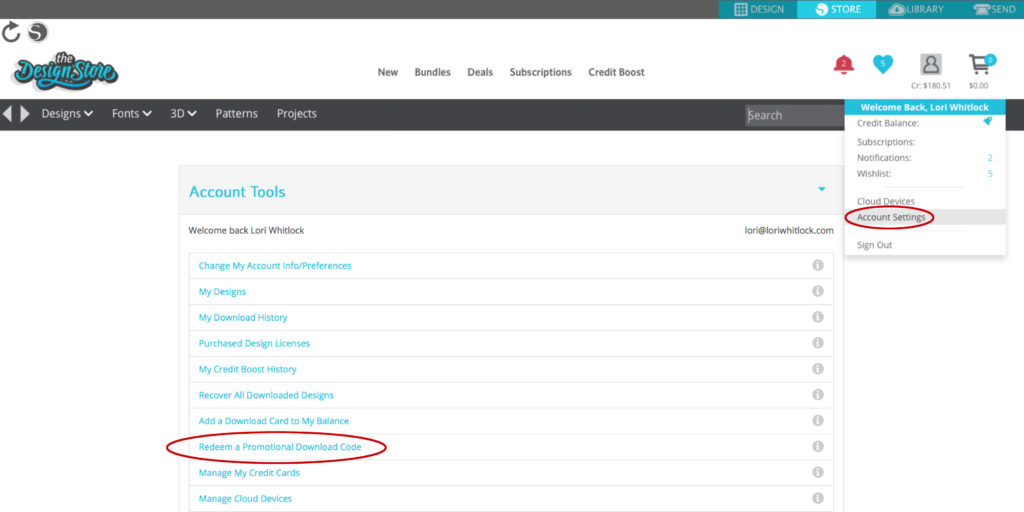 To redeem this download card, simply open the Silhouette Design store, click on your name & this screen will appear. Then click on Redeem a Promotional Download Card — and a screen appears where you can enter the 16 digit code that is hiding underneath the silver scratch off area on the card. Once you have entered this code, click on “Apply Card”, and the designs will download to your library.
