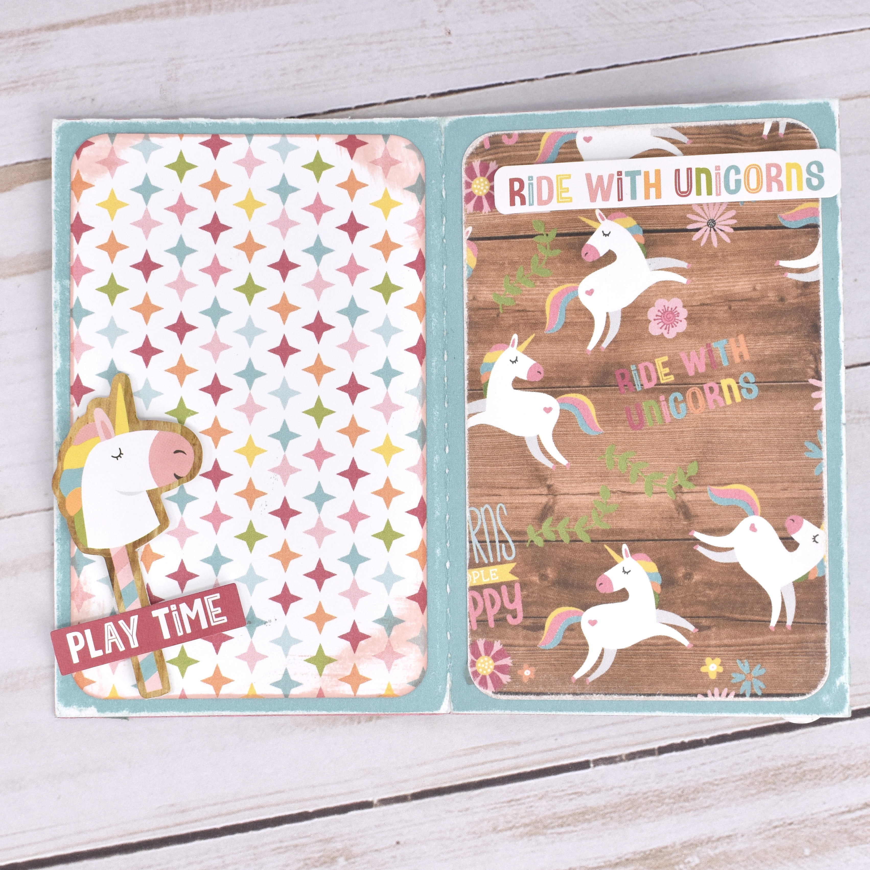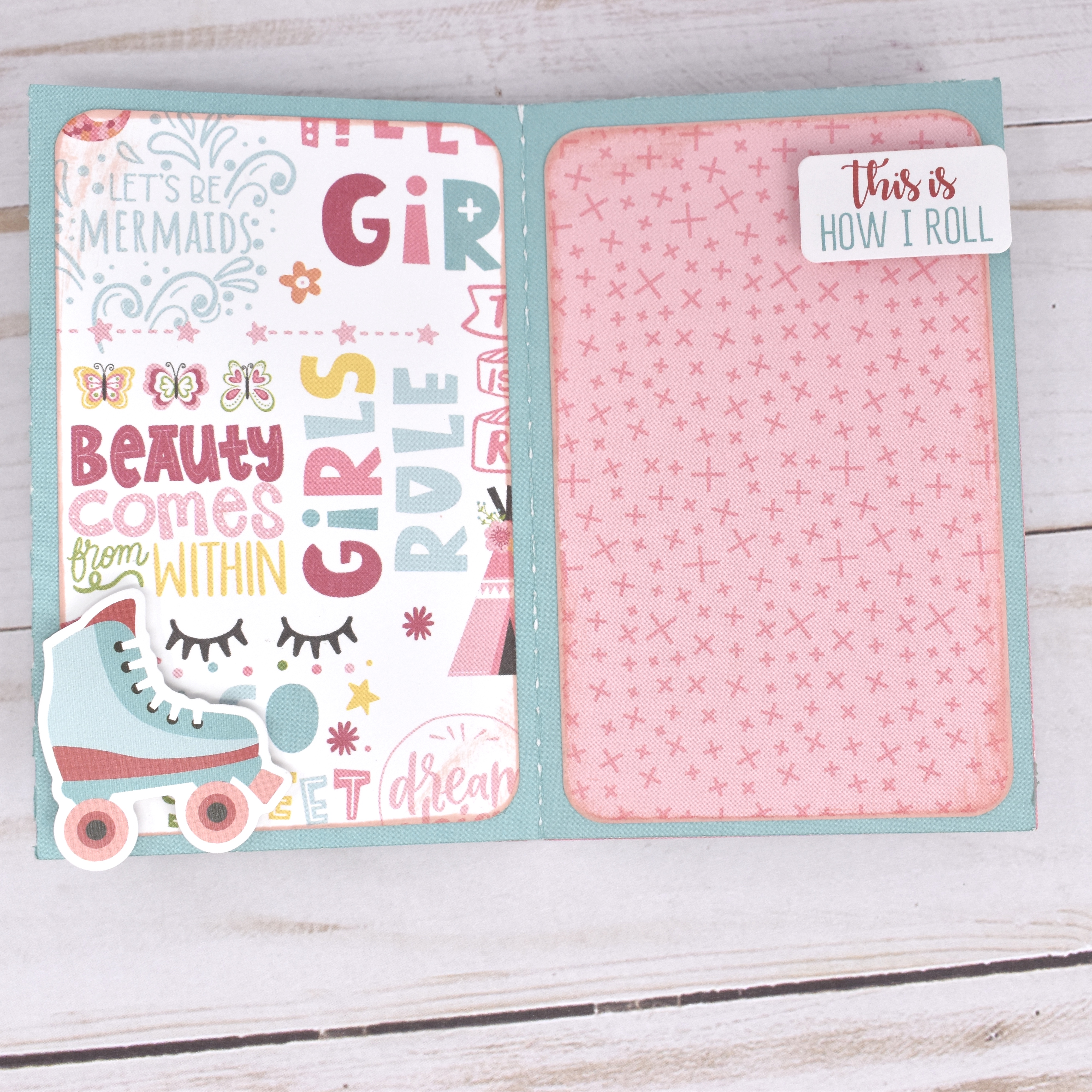 This adorable little mini-album was made using the Mini-Album with Band file available in Lori’s shop and at the Silhouette Design Store. This mini-album can be made using a single sheet of paper. I used one of the album itself and a few extras for the inside pages and band, just to change up the patterns inside the album. The original file includes a rectangle with rounded corners for the cover, but I duplicated that shape to create background pages inside the album. I ended up cutting 8 rectangles from two different double-sided pieces of patterned paper and alternated these inside the album. I know that pictures will eventually fill the mini-album, but I still wanted to add a little bit of flair to the pages. I used small stickers to accent the inside pages of the mini-album.