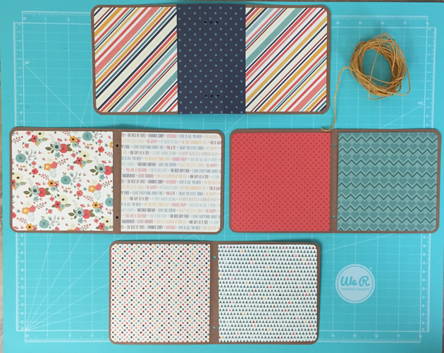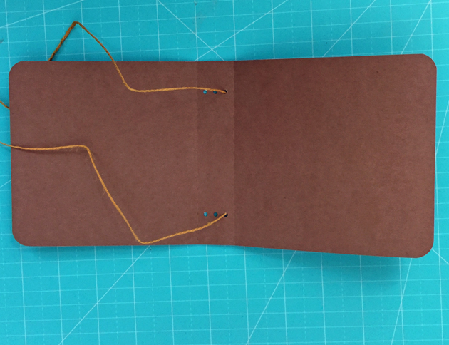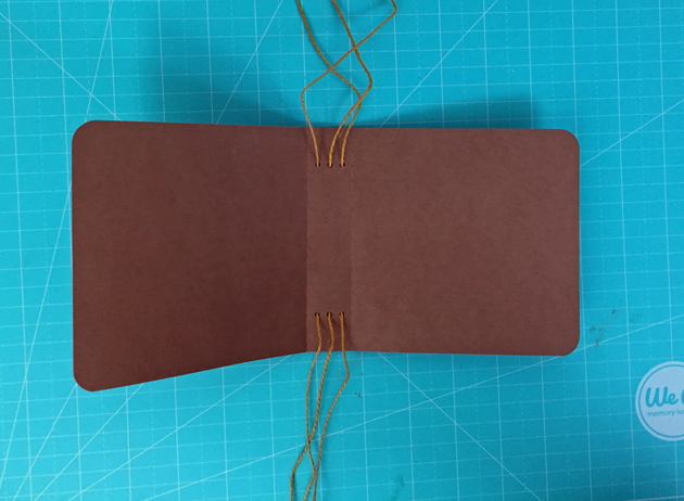 Next, thread one piece of twine through the holes in one of the pages and tie in a knot.