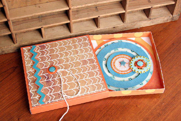 The slider box is going to see a lot of use in the future. This box can be used with or without the inside box. It’s fun to decorate and I love the bracket shape on the front flap. I created a mat for the flap by using the Internal Offset feature and also enlarged the file to fit my card. The chipboard gear and sticker ribbon on the front is acting as my closure. I attached it to the box with some foam adhesive and then attached the smaller circle and brad on the bottom part of the box, then wrapped a cotton string, up and around both pieces to hold it closed.