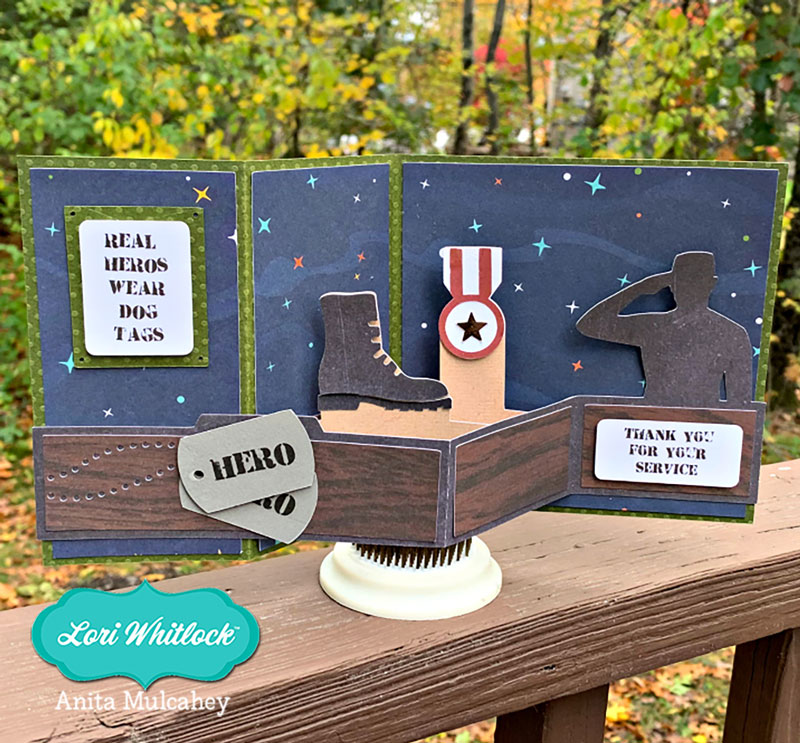 Veterans Day is a solemn day for me as I reflect on those men and women who are serving our Country. This card is called Pop Up Box Card Military which you can find here in the Lori Whitlock SVG store and here in the Silhouette store. It is very easy to put together and will surely let those serving currently or previously know that we value their service. These cards lie flat for mailing and are so wonderful when opened. Lori has many different styles of pop up box cards to choose from. I used some of Lori’s Echo Park collections including Summer Adventure, My Favorite Fall and I’d Rather be Crafting.