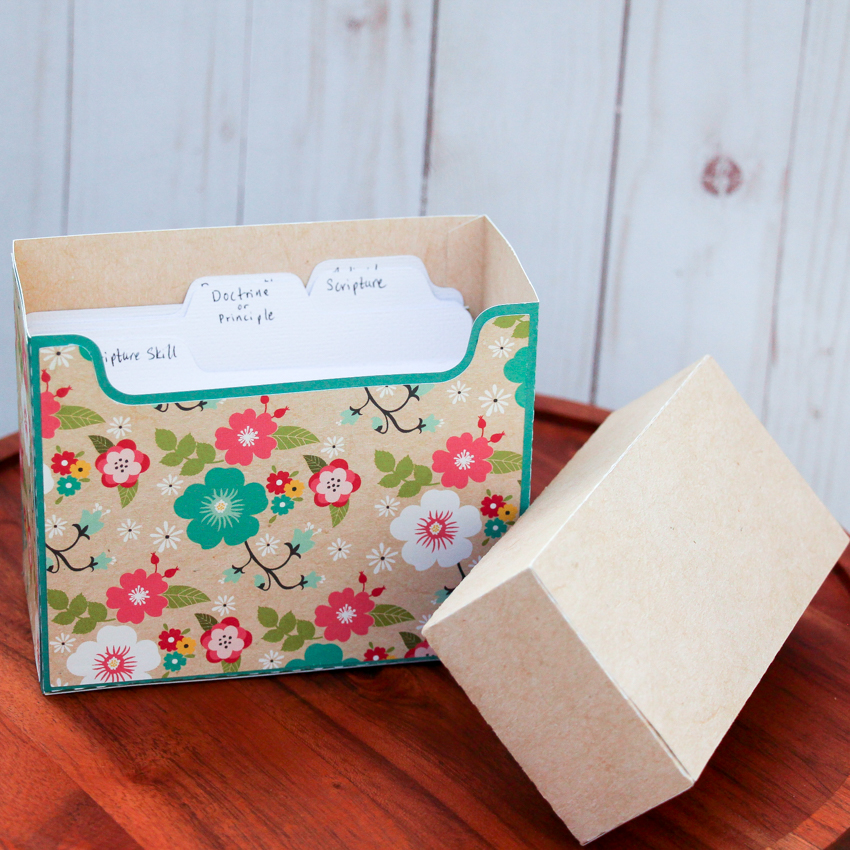 Welcome to the week. Are you working on organizing things this month? I needed a place for some 3 x 5 study cards, so I made this 4×6 Recipe Box (SVG, Silhouette.) Since the original size is for 4 x 6 cards, before ungrouping the file, I resized it for my project. I used paper from the Lori’s Forward with Faith Collection from Echo Park.