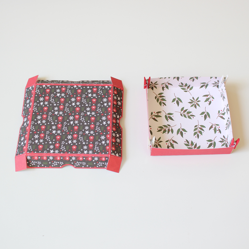 For the main box, I folded on the score lines for both the top and the bottom pieces and then adhered the panel pieces to the top lid. Next I glued the sides together on both pieces.