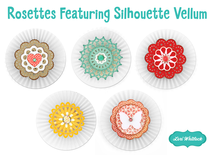 Have you ever played with any of the Silhouette Specialty Media products? This week I had the chance to play with some of the Silhouette Vellum. It cuts like butter, and it’s SO beautiful. I created 5 new files featuring the vellum that are available at the Silhouette Online Store so you can make these rosettes with your machine (you can also get the SVG’s HERE). And, as a bonus, you can pick up the vellum for 25% OFF during the promo! If you have not had a chance to play with the specialty media products, there really are some fun products that expand your creative options with your Silhouette CAMEO or Portrait.