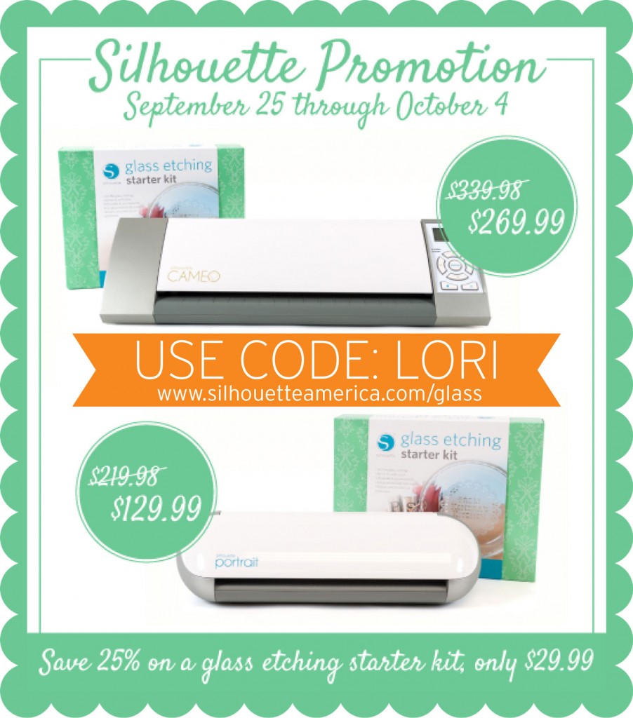 Last but not least… You have until Friday to cash in on the Glass Etching Promotion. To take advantage of these great prices, be sure to use coupon code LORI at checkout and shop through this link: www.silhouetteamerica.com/glass
