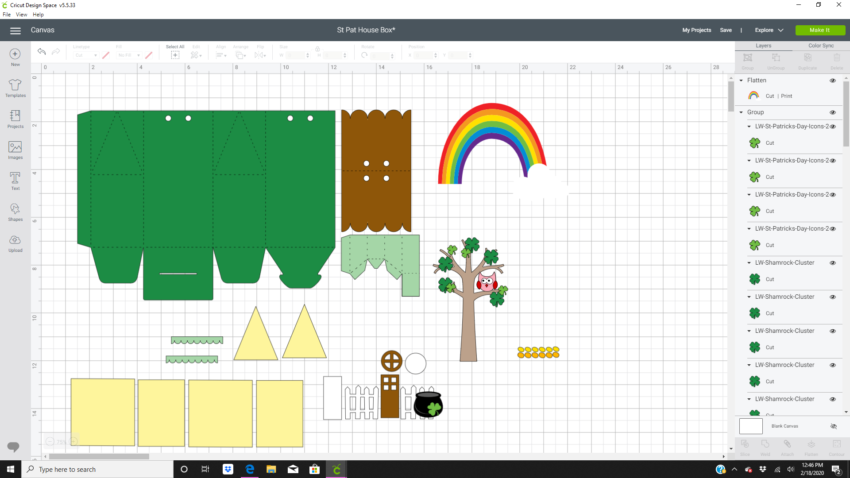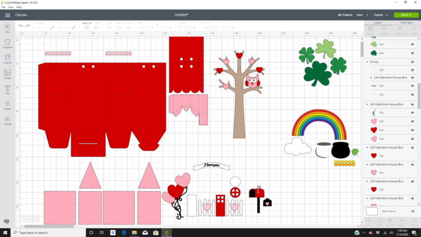 Once I had everything uploaded into Design Space I went to work deleting the images I wouldn’t be needing. The hearts, mailbox, and banner. I also only used two of the shamrocks and rainbow/pot of gold images.