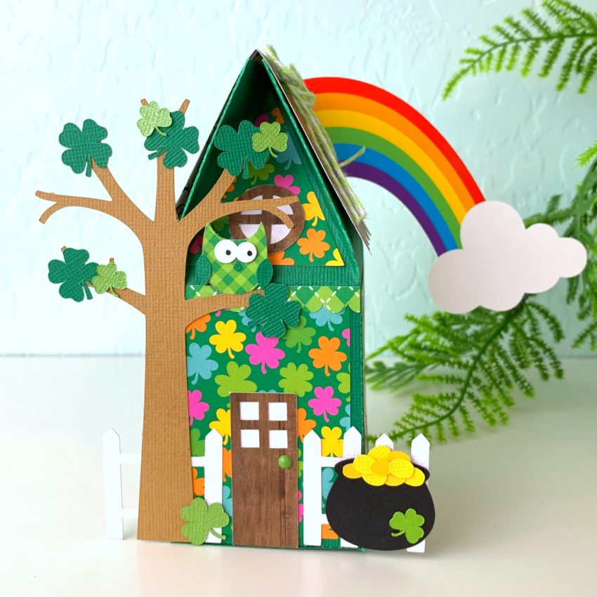 Hi there friends! Brandie here with an alternate theme for the Valentine House Box. (SVG, Silhouette) Thi little house comes in a Spring, Halloween, and Christmas version but I wanted a St Patrick’s Day house. To get this theme I also used the St Patrick’s Day Icons (SVG, Silhouette) and the Shamrock Cluster (SVG, Silhouette).