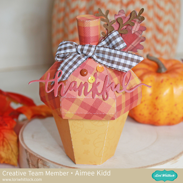 The next piece of my project is this little cutie. This is the 3D Acorn Box that you can find at the Lori Whitlock Stop or at the Silhouette Design Store. The top piece lifts off and can be filled with small yummies. I decorated it by adding a bow, sequins, enamel dots, and a couple of die cuts from the Celebrate Autumn collection.