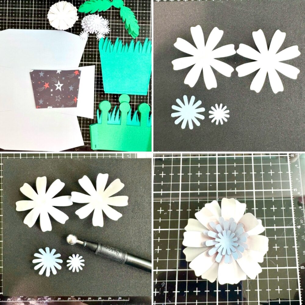 To begin this project, I cut all the flower pieces first so that I could shape the flowers while my Cricut cut the remaining pieces. The flowers have five layers total. Two of the layers make the flower, and three for the centers. I used a stylus tool and a foam mat to shape my flowers. This process takes a little time, but it wasn’t complicated.