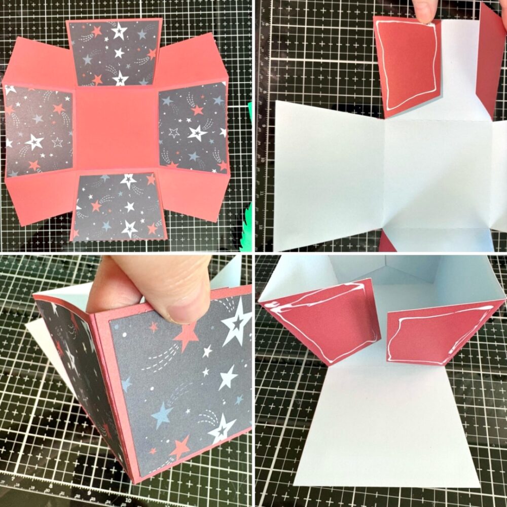 For the pot I folded all of the score lines into mountain folds, inked the edges, and glued the decorative panels in place. Two of the sides of the pot have two large tabs each. I added glue to one tab at time and made sure to line everything up with the edge of the pot. I repeated this process for all four corners.