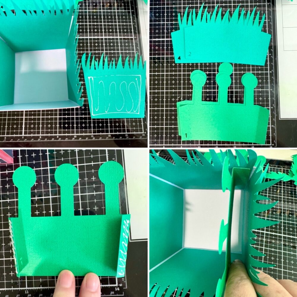 I then glued into place the four grass panels to the inside of the pot, one on each side. For the inserts I folded all of the tabs into a valley fold and added glue to outside of the tab. I eyeballed this part but I tried to make a sure the number three insert was in the middle of the pot. There is five inserts total, three for the flowers and two grass inserts. I inserts are numbered which makes gluing them in order easier.