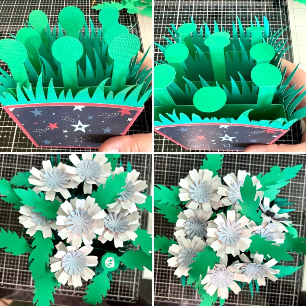 With all the inserts glued into the pot I folded down the round heads for the flowers and leaves. I glued the leaves on first then glued the flowers on top of that.