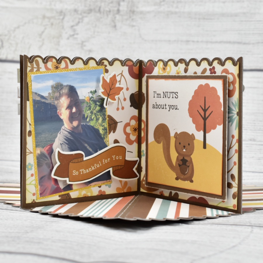 This adorable card lays flat and then opens like an accordion to reveal your photos and personalized elements. The file gives you the option to create the square or pentagon depending on how many pieces you use for the project.  I cut four copies of the file to create my square shaped card.  I assembled all of the pieces and added my pictures and embellishments before assembling the card pieces. The project was super easy, and only took me a couple of hours to create.  Be sure to watch Lori’s video for an assembly tutorial.