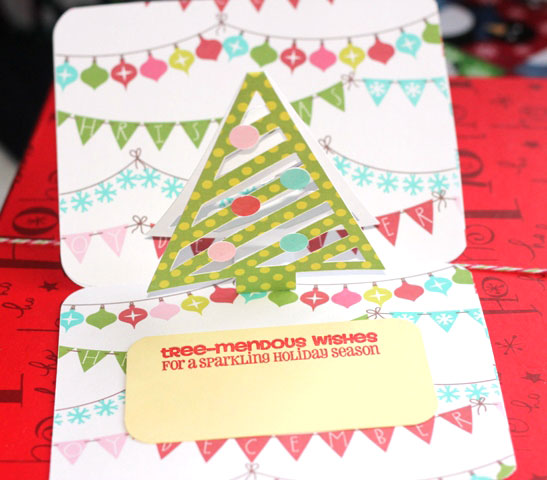 Joy has used the “Christmas Tree Pop-up Card” and the “Reindeer Pop-up Card.” These are both so adorable. Not only is this an SVG cute file, but also uses a digital scrapbooking file. Joy printed Lori’s “Christmas Day Paper” found at Jessica Sprague (and on sale right now for 40% off) and lined the card up perfectly with her machine to cut it. She gives directions on her blog if you need help. Thanks Joy. These are both adorable.