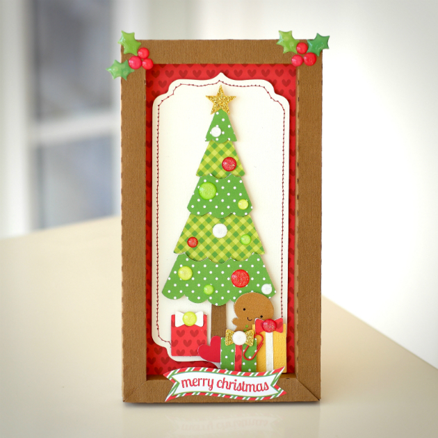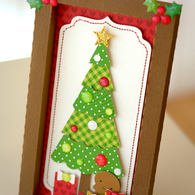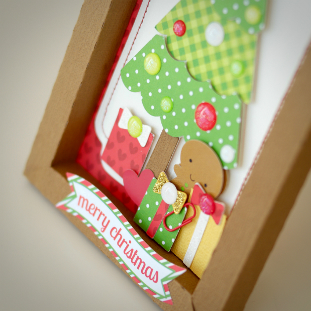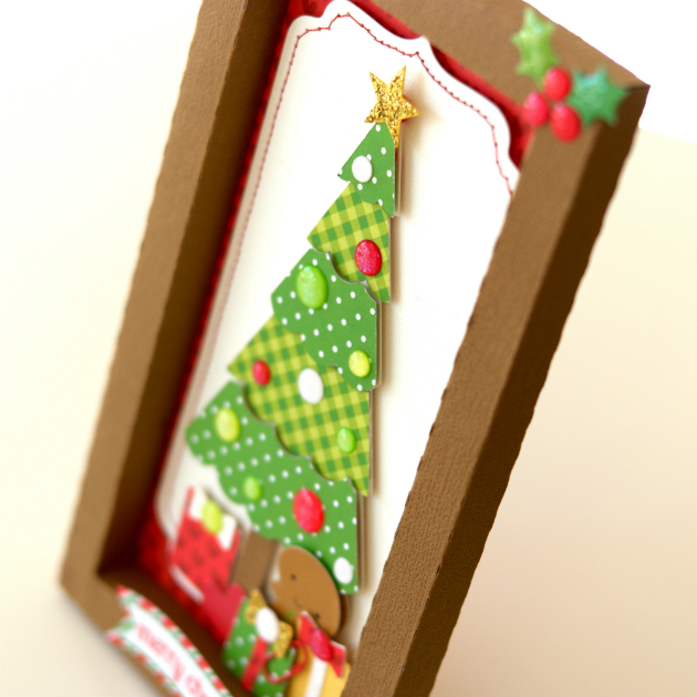 Next I added some sprinkles (sparkle enamel dots) to the tree and the presents. I attached my sentiment directly to the bottom of the box.
