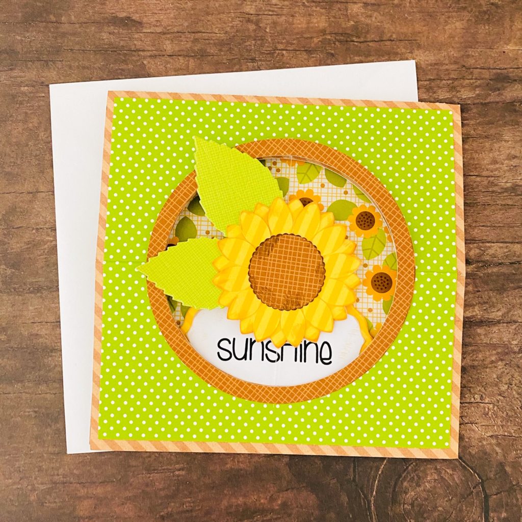 Here’s a look at all the cut elements just before assembling them. I used a little brown ink on the edges of the sunflowers and acorns to help them stand out a bit more. I also added a couple of die cut leaves to the sunflowers to match my paper. I realize the leaves reduce the floating effect somewhat, buy I think it turned out cute anyway!