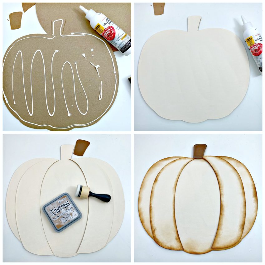 The width of the large pumpkin is 11.5 and the width of the small pumpkin is 6.5. I used the Scotch tacky glue to glue each layer. Then placed a heavy book on top of the pumpkins while the glue dried. Before I assembled the pumpkins I inked the edges with Vintage Photo Distress Oxide ink. I then used tacky glue to assemble the pumpkin layers.