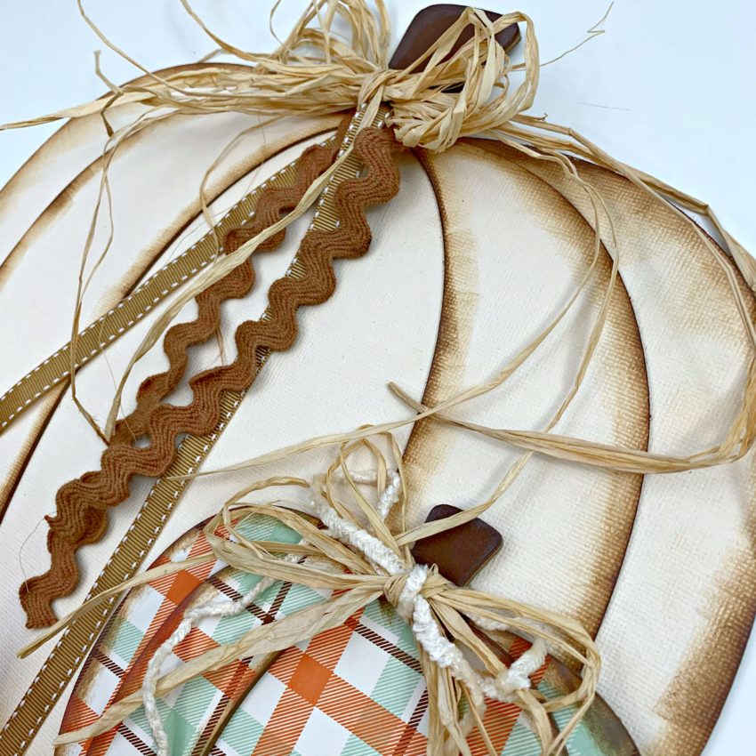 I tied some raffia and ribbons from my stash around the stems. I then glued the smaller pumpkin to larger one.
