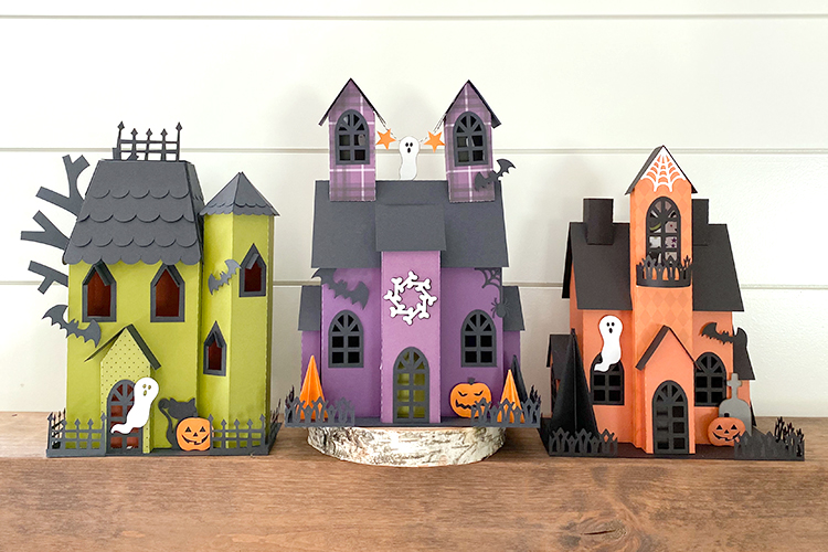 Today I’m sharing one of Lori’s Large Haunted Houses (Silhouette, SVG). I really wanted a house that could be used for both Halloween and Fall, so I made the house in neutral colors, and attached all of the embellishments with magnets. That way can switch out the Halloween décor for Fall/Thanksgiving décor later.