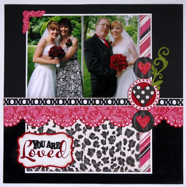 with 12×12 pattern papers, photo mats, and colorful embellishments.