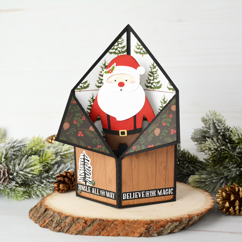 Hello everyone and Happy Thanksgiving! Marcia here today. I have to admit, I slacked off in sending Christmas cards the past few years. Sometimes life is just so crazy busy! I want to rectify that this year. With Covid restrictions going back into place, it doesn’t look like I’ll get to see distant family for a while. Plus I should have lots of time on my hands since I won’t be going out anywhere. I love making box cards because they do double duty as Christmas decor. Don’t worry, these do fold flat for mailing! I was drawn to the new Lumberjack Santa Tuxedo Box Card cut file because I thought it would appeal to the young and old alike. This cut file can be found here (SVG / Silhouette ).