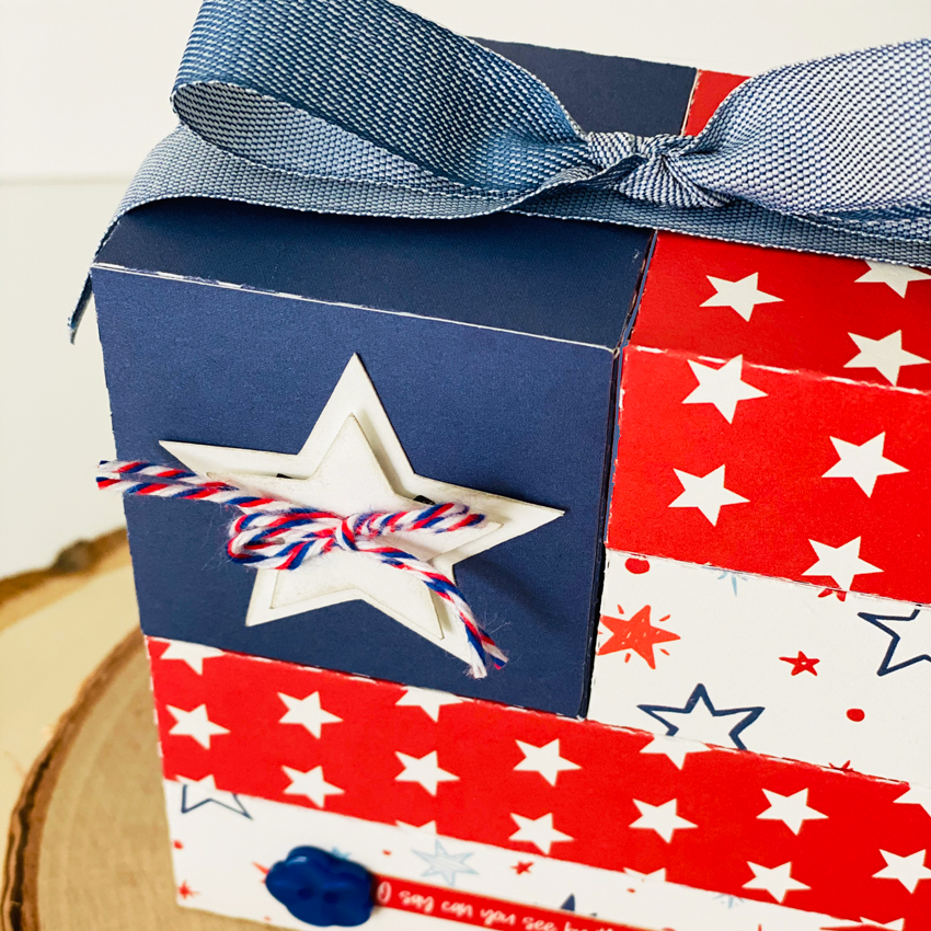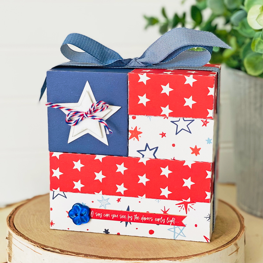 Hi guys, Traci here! Today, I have a great home decor project to share with you for the 4th of July. I made it using two Lori Whitlock cutting files called Pinwheel 3 (SVG, Silhouette) and Uncle Sam Hat Box (SVG, Silhouette). With it’s patriotic colors and festive paper, it’s sure to add a fun accent to your home or party.