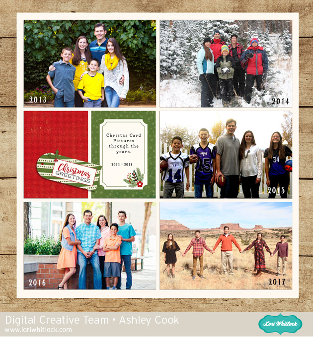 A few years ago, I started keeping one Christmas card that I sent to be displayed with my Christmas decorations. I find my own family likes to look at the family pictures of years past. I thought it would be a great idea to also capture these Christmas Card photos through the years on a layout. I created this one for years 2013-2017. I’ll have to dig through my digital files to find my older pictures, but how fun is this? This would also be great if you take a yearly family pajama picture! I used A Perfect Christmas from Echo Park, designed by Lori. All of the digital files are 50% off during the month of December at Snap, Click, Supply, so it’s a great time to stock up on some lovely kits. Here is a link to Lori’s Gallery at Snap Click Supply.