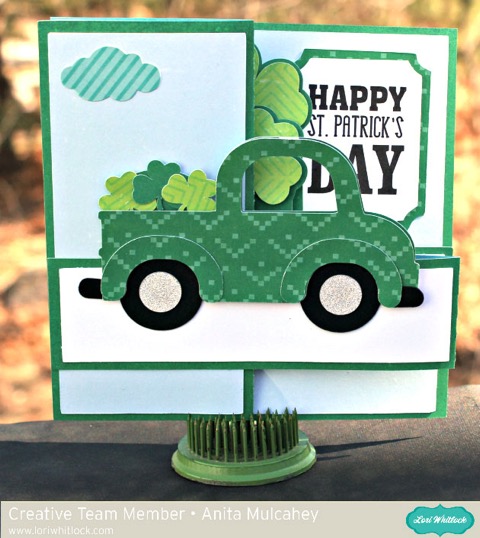 Anita here with a card that I just fell in love with.  These pop up box cards of Lori’s are so cute and so easy to put together.  You can find this file called Pop Up Box Card St. Patrick’s Truck here in Lori’s store and here in the Silhouette Store.  I made this for my son and daughter-in-law as he has and loves his truck.  I used several of Lori’s Echo Park Collections to complete my card.  I used Happiness is Homemade, Celebrate Easter, I Love Winter, Celebrate Spring and some cloud stickers from the Celebrate Spring collection and those adorable enamel dots from Celebrate Easter.