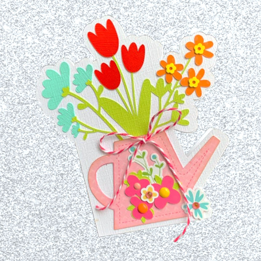 I love that Lori’s files are color coded, it makes everything come together faster.  I added a bit of stitching with my Silhouette pen to the watering can, then just assembled.  I used Lori’s new All Girl collection for the watering can and added a few extra little stickers from that collection as well.  It’s just a darling card that will bring a smile to all!
