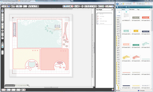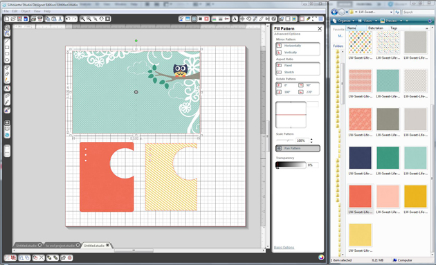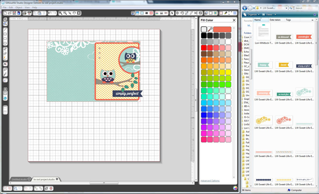 Lori has a cute owl and tree cut file that matches this collection in the owls set, I used the eyedropper under the Fill Color and selected colors from the collection so everything would match or you can fill them also with the digital paper. The sentiment is an element from the Sweet Life collection, to cut that out you need to first do a trace, that will be covered in another tutorial.