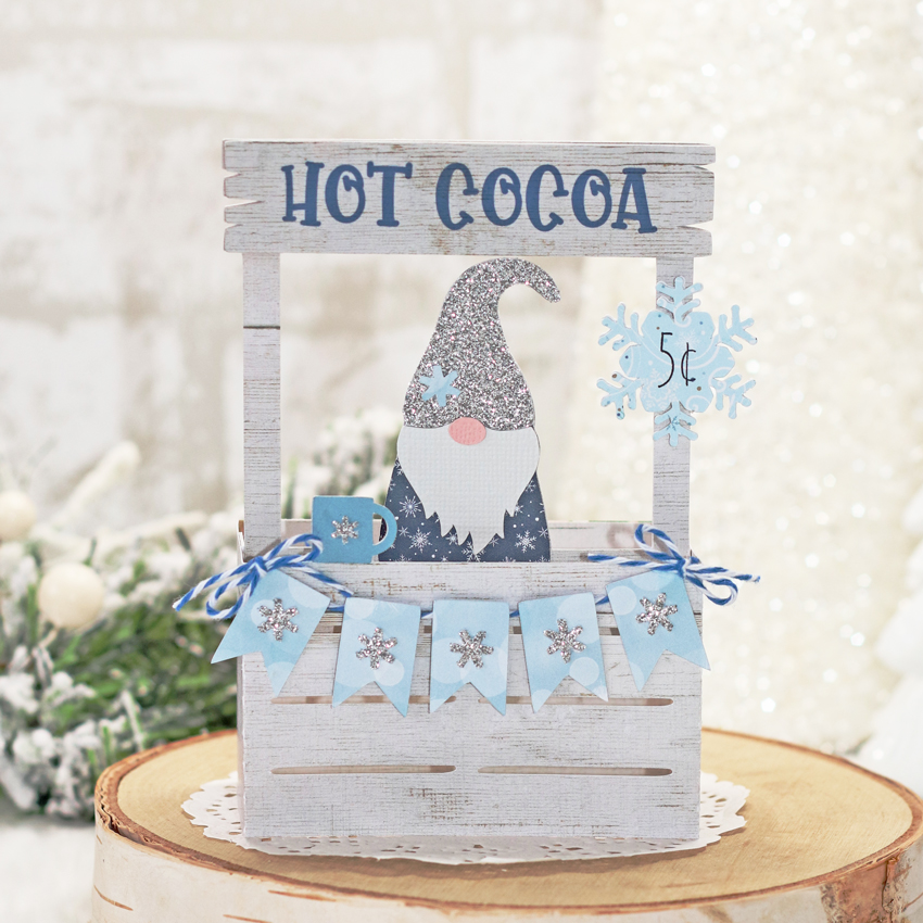 Marcia here today. I have a holiday card to share with you today. No, it’s not too late to make and send holiday cards! New Year is a holiday so for me, it’s ok to send a card after Christmas. I love to send holiday cards to friends and family as well as receive them. I especially love a box card that can sit on a tabletop or counter and doubles as home decor. This Hexagon Pop-Up Card Hot Cocoa Booth With Polar Bear (SVG, Silhouette) cut file can be found in Lori’s Store along with many other varieties of holiday cards. I used the new Echo Park Paper The Magic Of Winter collection.