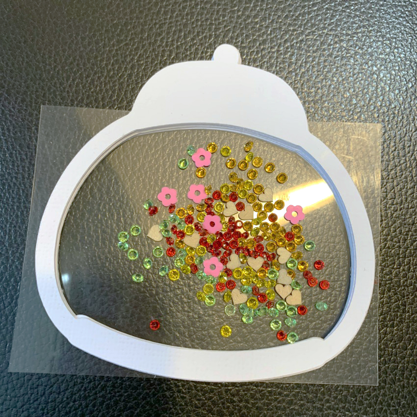 After you have all these cut, start layering them and glue with a good strong adhesive. Layer 10 of them together, then add a piece of transparency on the and the back side of your layered piece. I used the same glue for this too. Then add the 11th frame piece to finish the back side. Fill with beads and sequins. You can see the depth of your shaker window in the picture below.