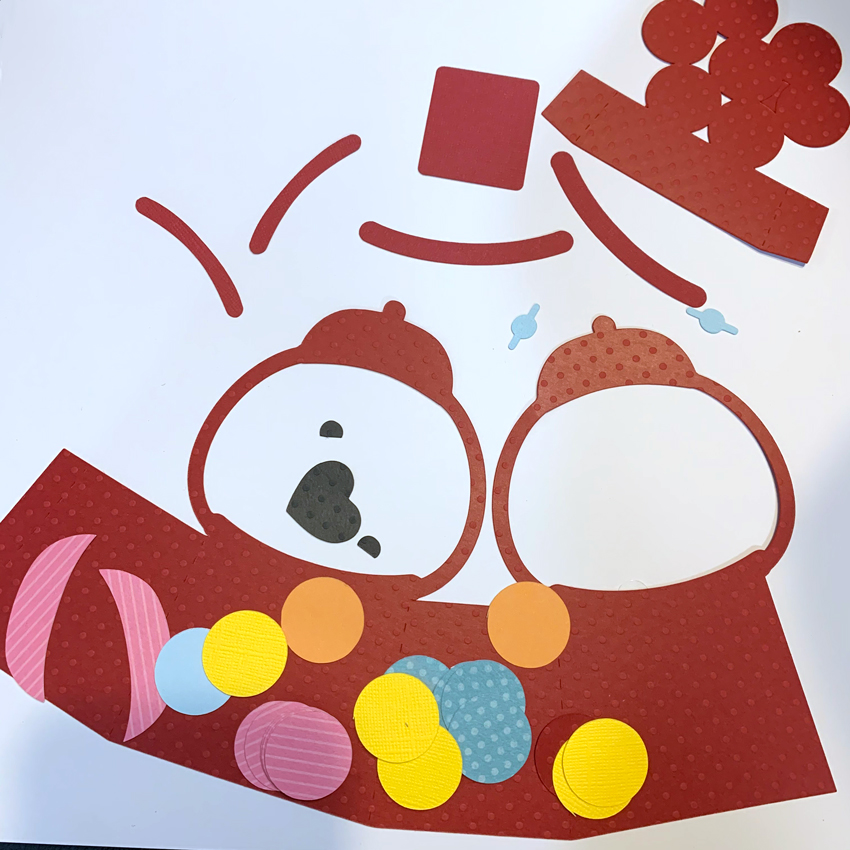 Add another piece of transparency to the top and then the final frame piece to seal your the shaker pieces inside. Assemble the Gumball Box card and Glue this shaker in place to the front piece of your gumball machine.
